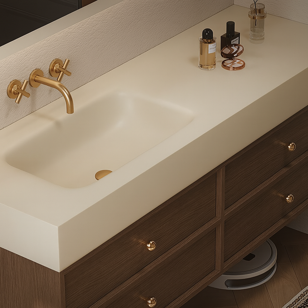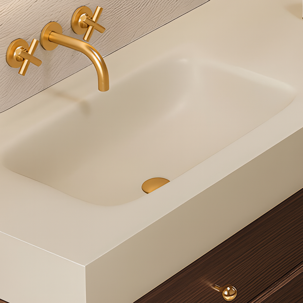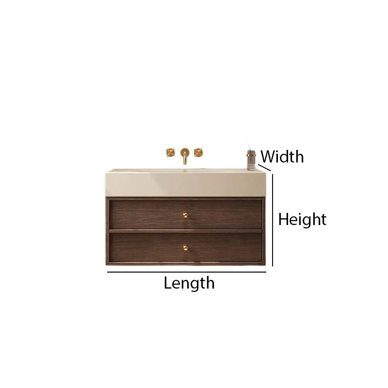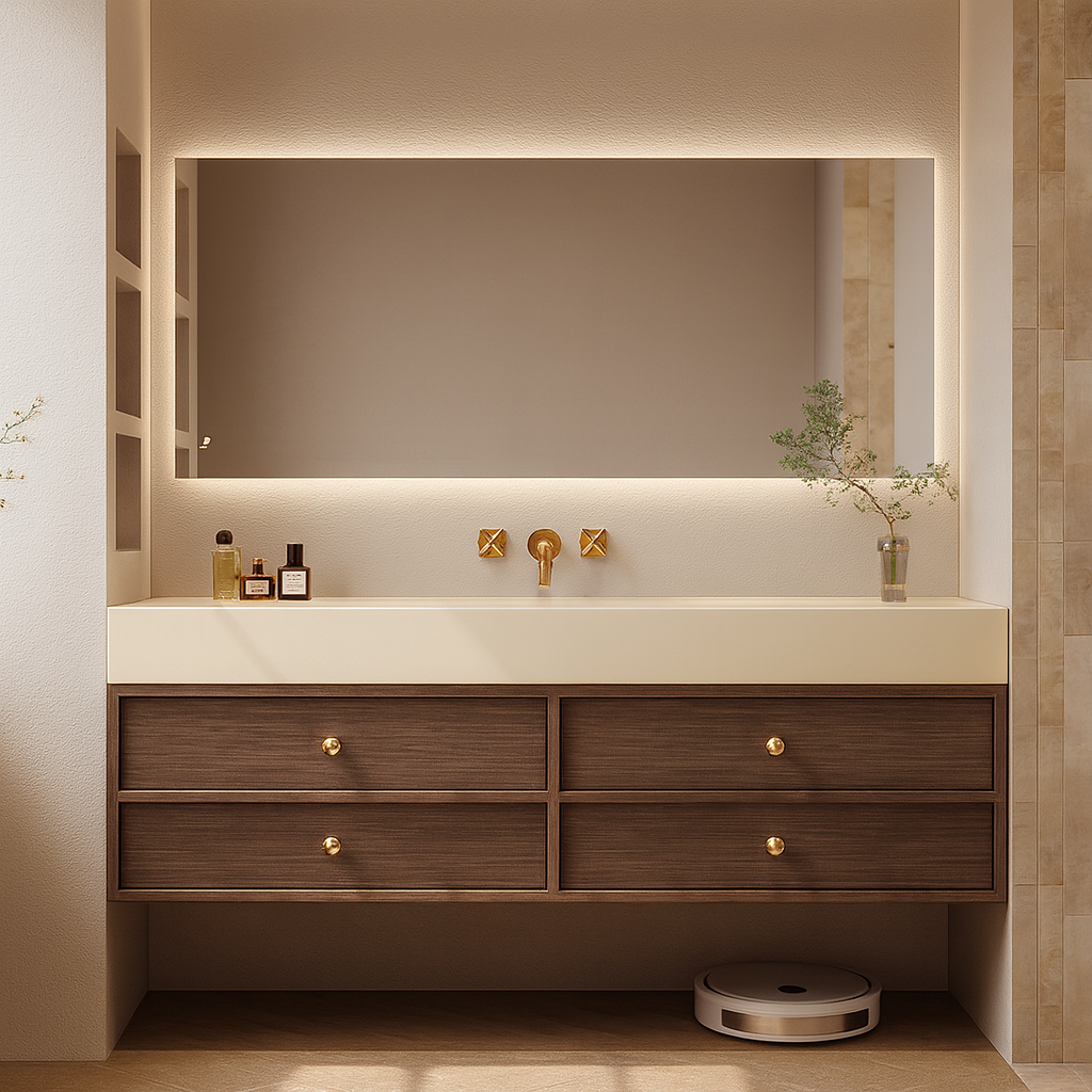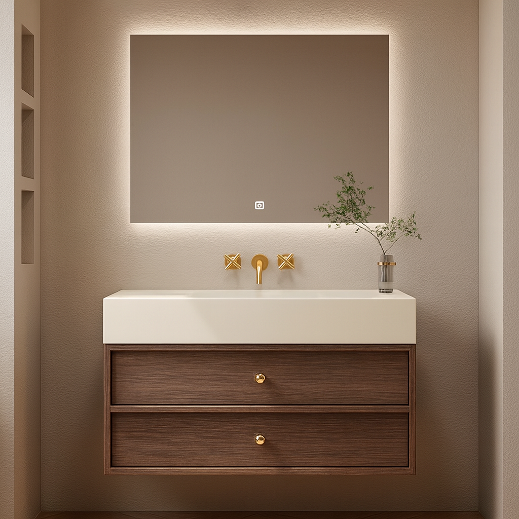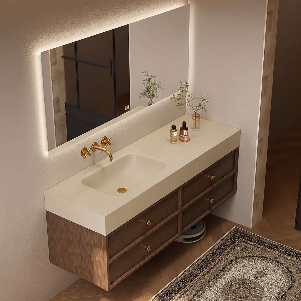 Designed for modern interiors that value both beauty and practicality, this floating vanity features a smooth matte integrated basin paired with a natural wood base. The two spacious drawers provide generous storage for towels, toiletries, and daily essentials, keeping your bathroom organized and refined. The minimalist silhouette is elevated by brass hardware and wall-mounted fixtures, while the floating design visually expands the space, enhancing lightness and flow. Perfect for Japandi, modern farmhouse, or minimalist homes, this vanity blends natural materials with architectural simplicity — transforming your bathroom into a serene, spa-like retreat.