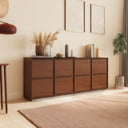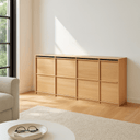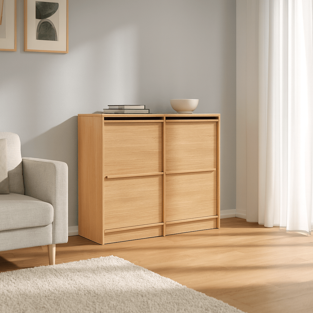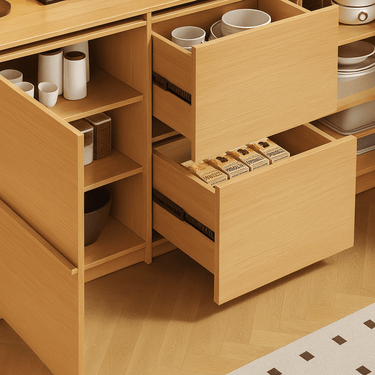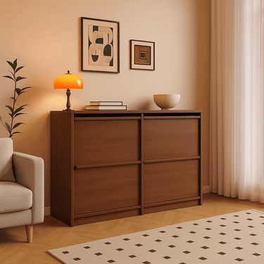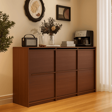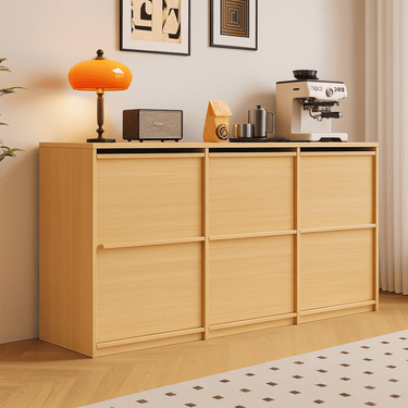 Crafted with a modern aesthetic, this wooden storage cabinet provides a practical solution for organizing kitchen essentials. Its clean lines and natural finish make it an easy fit for various kitchen interiors. The cabinet is designed with sliding doors that open smoothly to reveal generous storage compartments, suitable for dinnerware, cookware or pantry items. The flat top surface provides additional space for small appliances, coffee makers, or decorative pieces. Perfect for kitchens, dining areas, or multipurpose spaces, this cabinet combines storage efficiency with a simple modern look. Its versatile design makes it equally suitable for everyday use and as a stylish storage solution in open living areas.