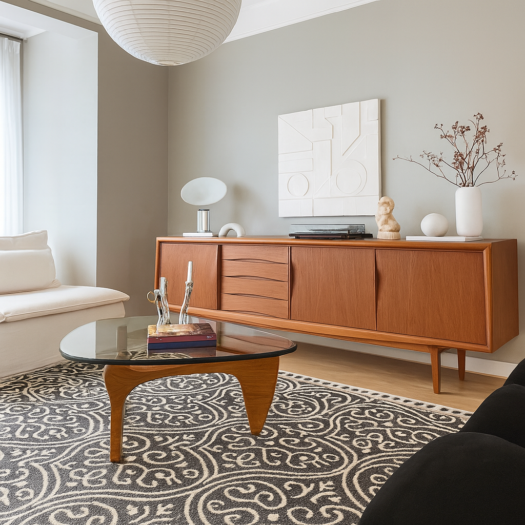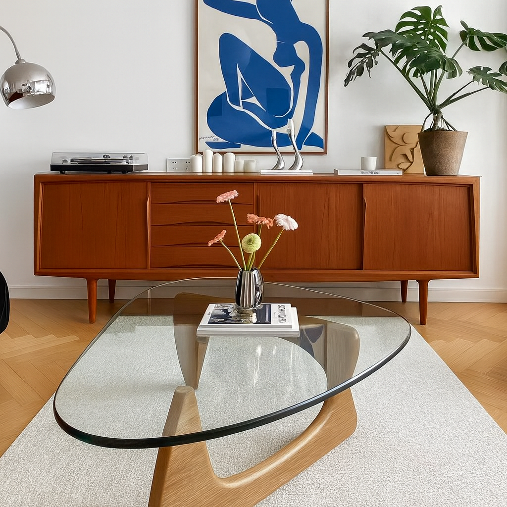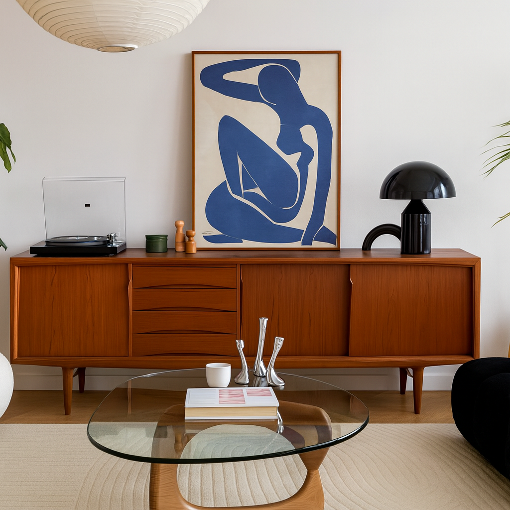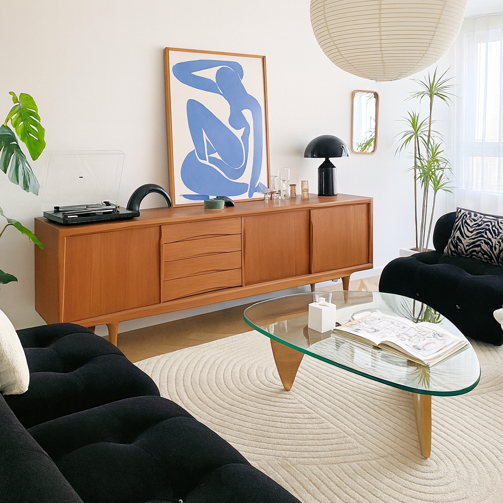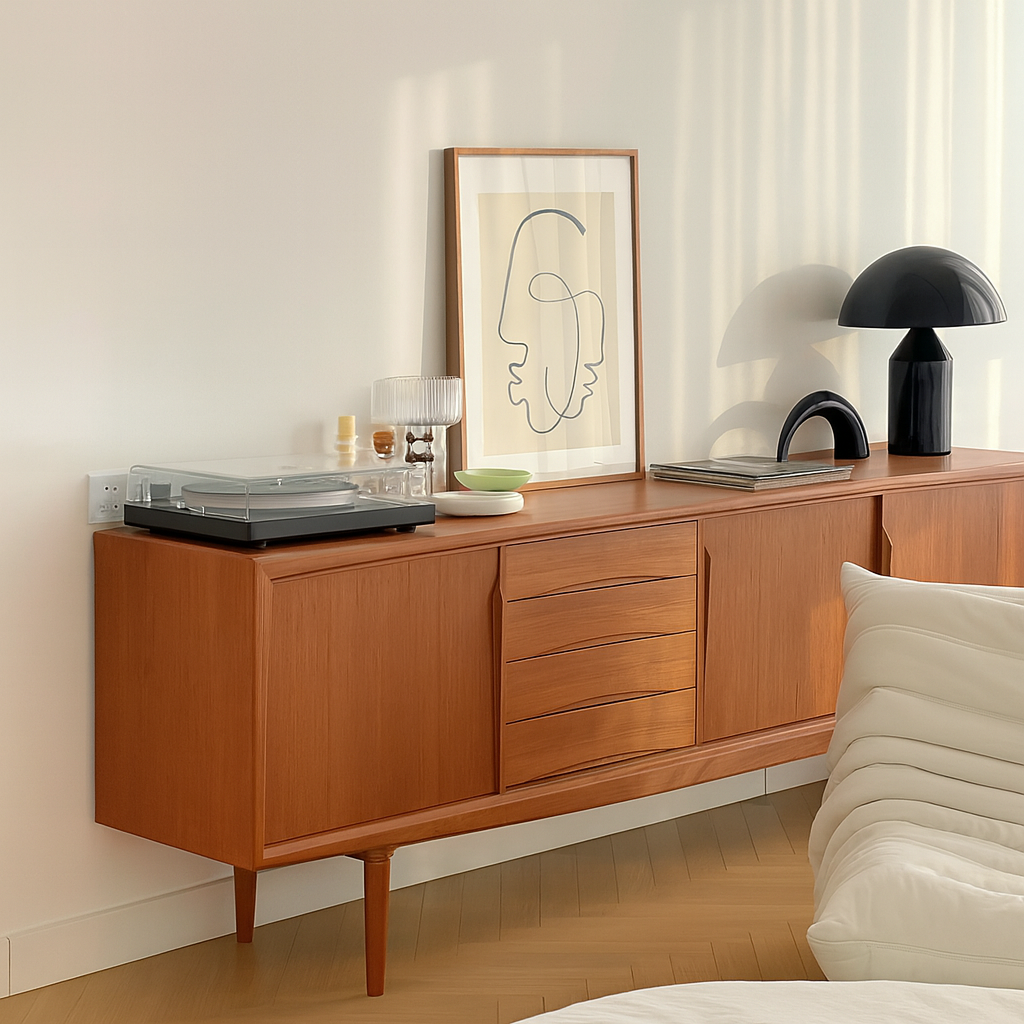Designed with mid-century influences, this wooden sideboard combines functionality with elegant form. The sleek silhouette, gently curved drawer fronts, and tapered legs reflect a classic design that complements both vintage and modern interiors. Crafted from durable wood with a smooth teak finish, it includes spacious compartments and drawers ideal for organizing tableware, records, or home essentials. The surface provides ample space for displaying art pieces, lamps, or decorative accents. Perfect for living rooms, dining areas, or home offices, this sideboard adds warmth and sophistication to any space. Its versatile design pairs effortlessly with minimalist, Scandinavian, or retro-inspired furniture.