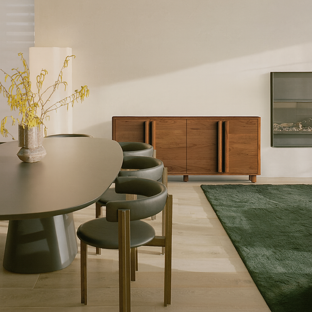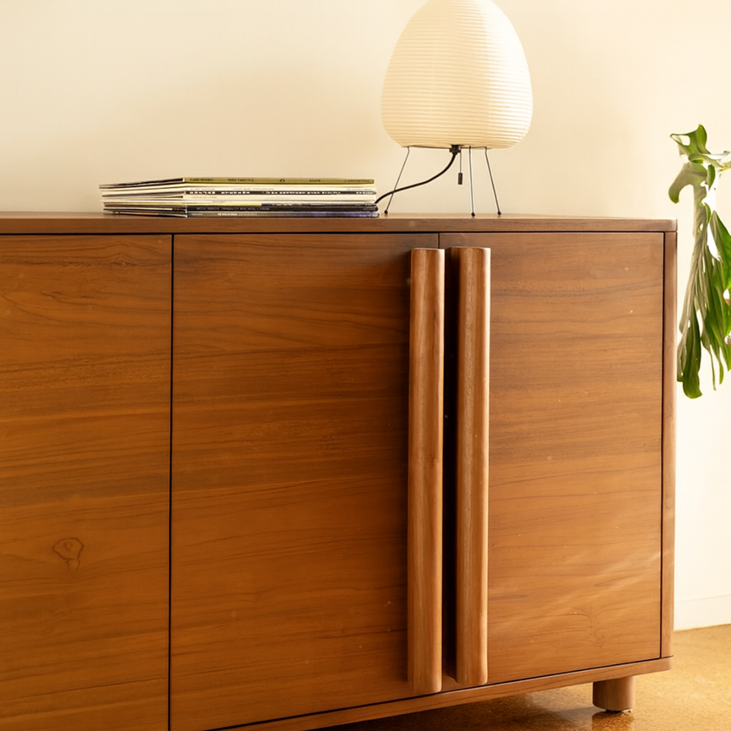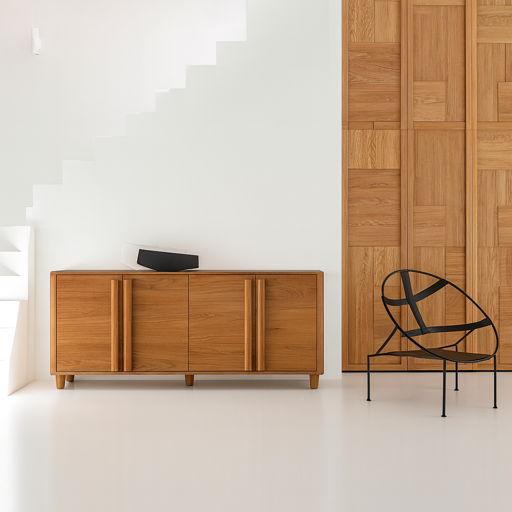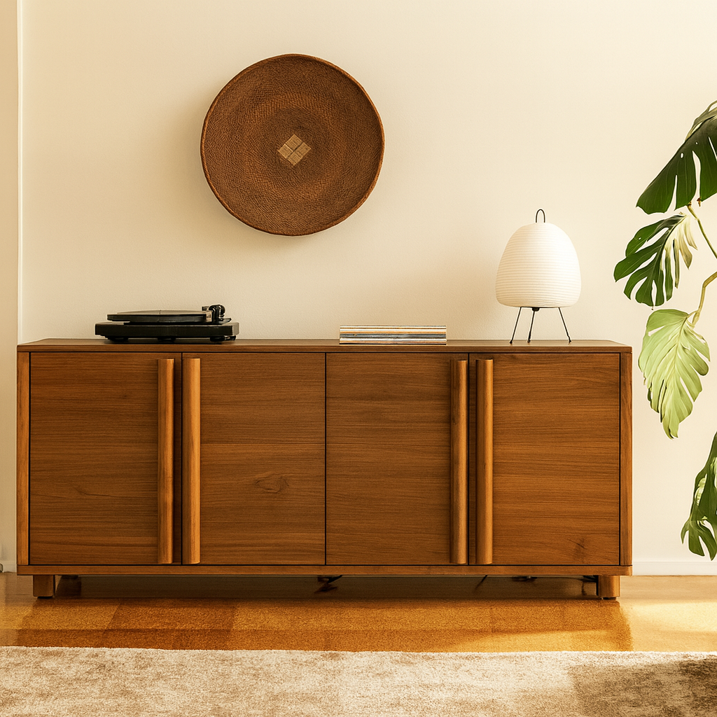 Crafted with timeless mid century design, this wooden sideboard adds warmth and functionality to your living space. Its simple silhouette highlights the beauty of natural wood grain, while the solid structure ensures long-lasting use. The sideboard includes four cabinet doors with elongated vertical handles, providing generous storage for dinnerware, books, or everyday essentials. Elevated legs add a balanced look and keep the piece grounded yet airy. Ideal for living rooms, dining rooms, or entryways, this sideboard blends practicality with classic design, serving as both a storage solution and a stylish focal point.
