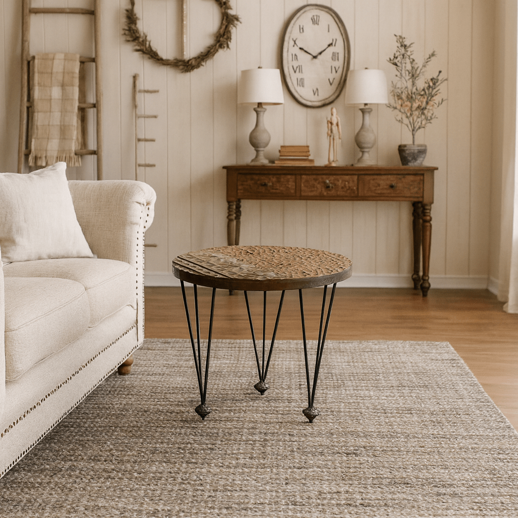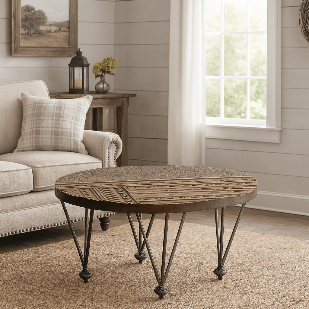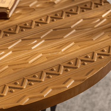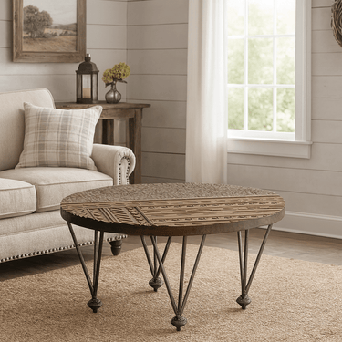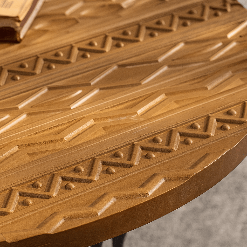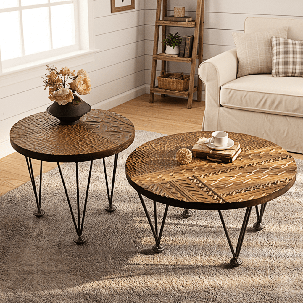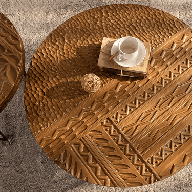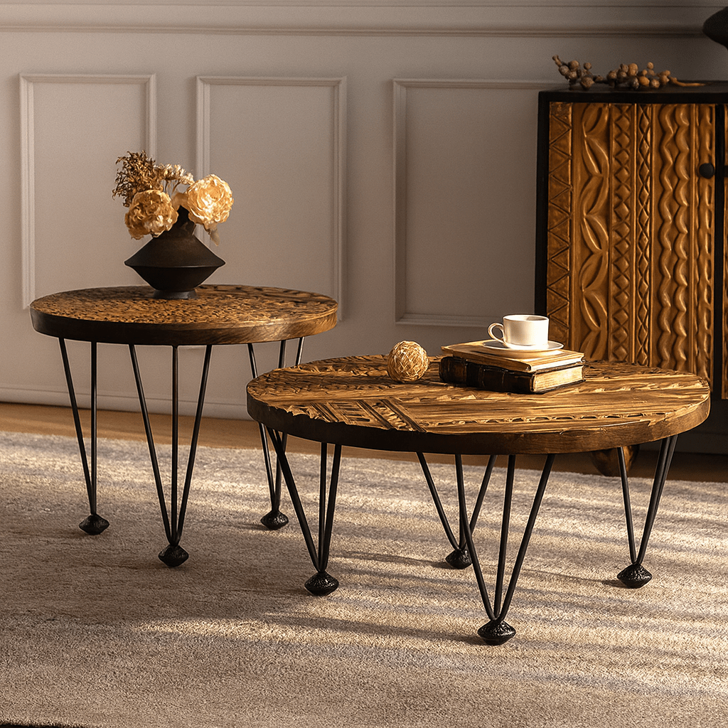 Bring warmth and texture to your home with this hand-carved solid wood coffee tables, featuring intricate detailing inspired by global artistry. Each tabletop is meticulously carved by hand, highlighting geometric and tribal motifs that celebrate traditional craftsmanship. The tables rest on slender black iron legs, balancing rustic character with modern elegance. Perfect as a living room centerpiece, side table pair, or bohemian accent, this coffee tables embodies the soul of handmade furniture — authentic, natural, and full of charm. Use the two tables together for layered styling or separately in different rooms. Their versatile design complements boho, modern farmhouse interiors beautifully.