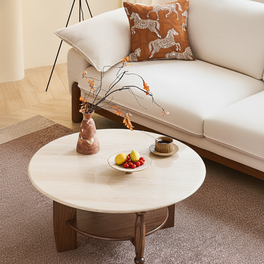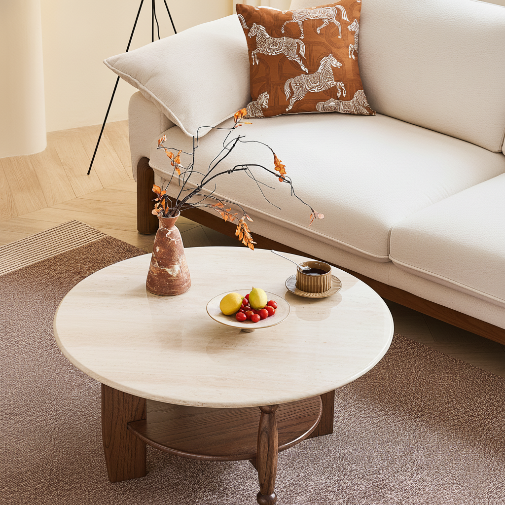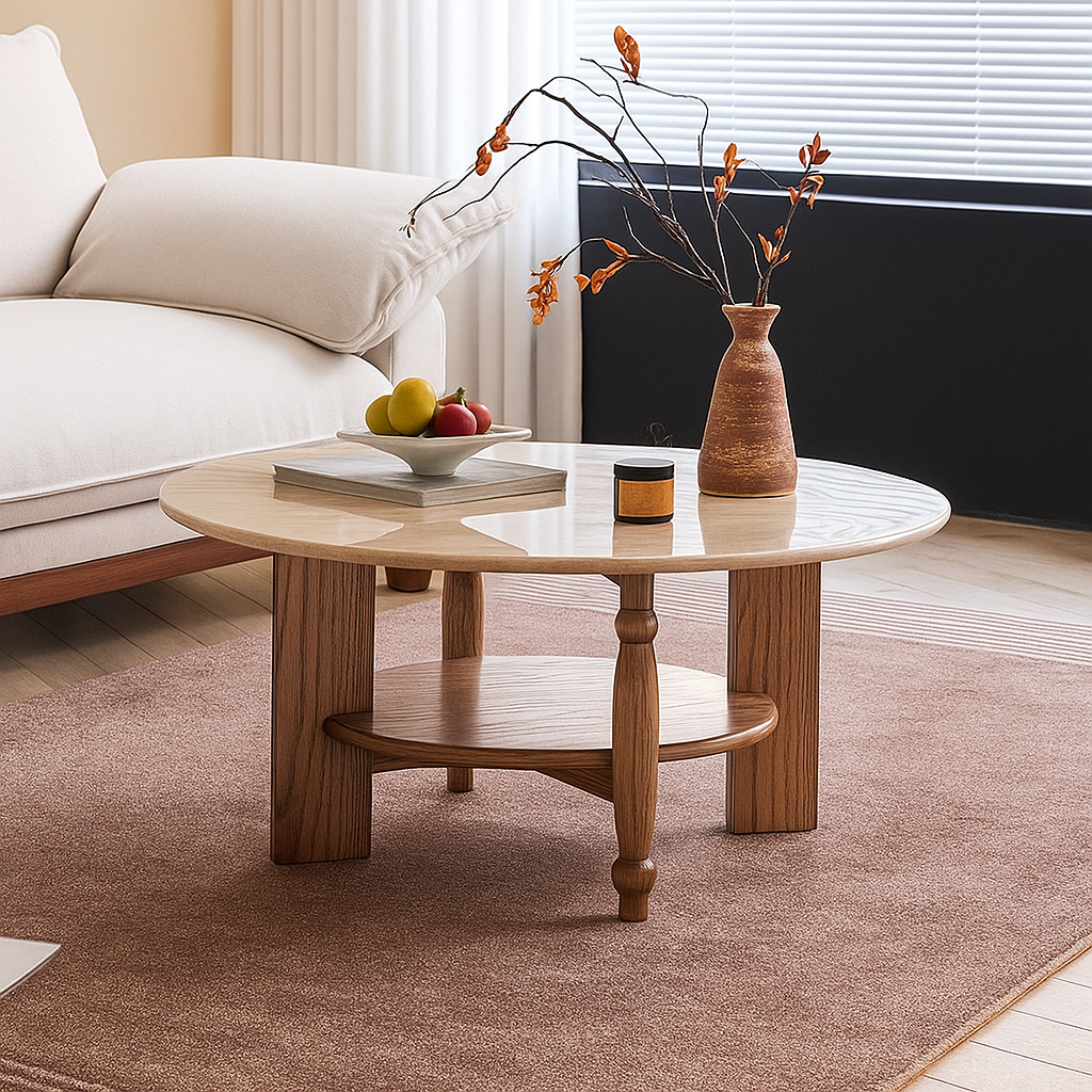 Inspired by mid century aesthetics, this oak solid wood coffee table showcases elegant simplicity with its marble top and clean silhouette. The sculpted legs and smooth edges reflect refined craftsmanship, while the oak solid wood finish brings warmth to your interior. Designed with a practical lower shelf, it offers convenient space for storing books, decor, or everyday essentials. Constructed from oak solid wood, the table ensures lasting stability and style. Perfect for living rooms, lounges, or reading corners, this coffee table adds a classic mid century touch that blends effortlessly with both modern and vintage-inspired decor.