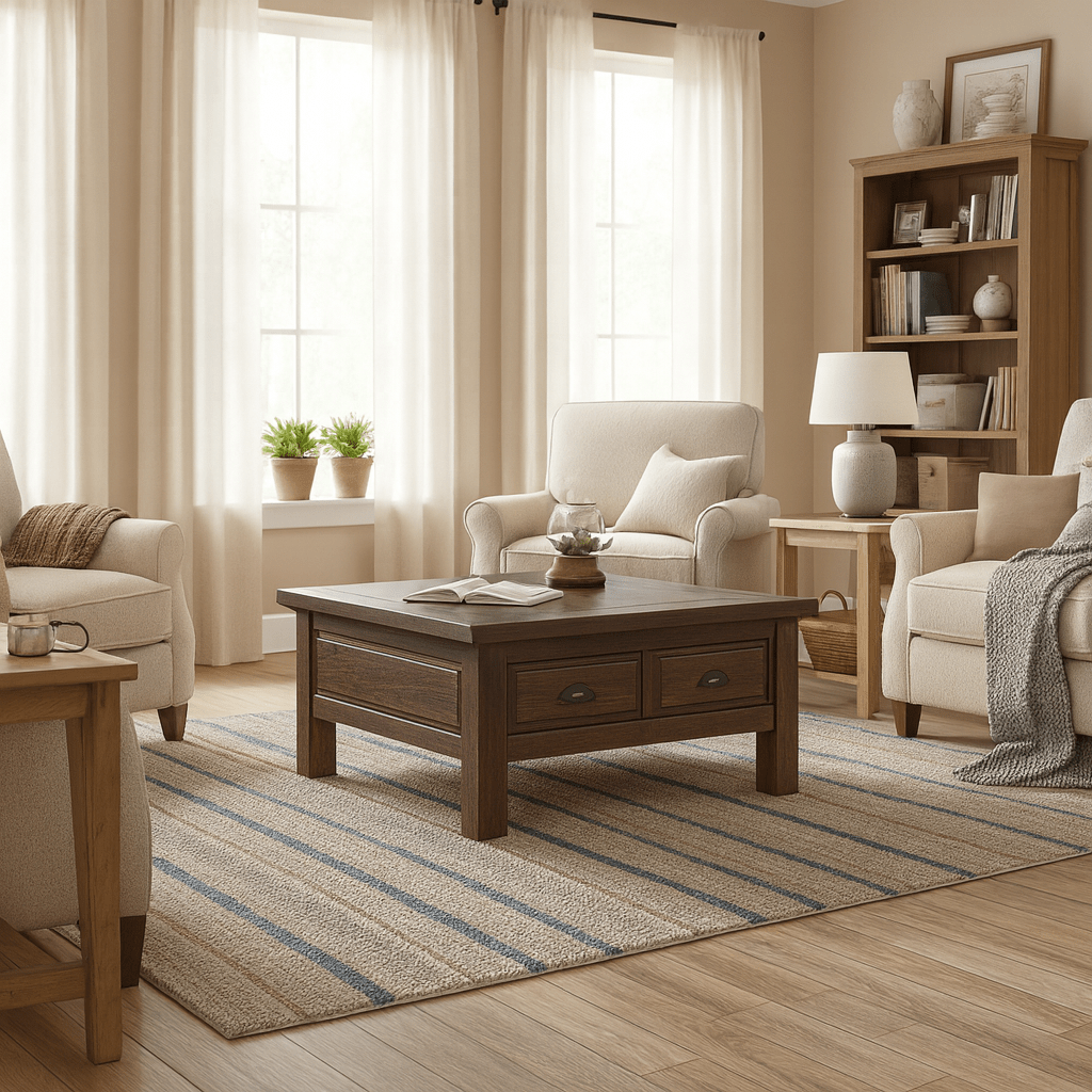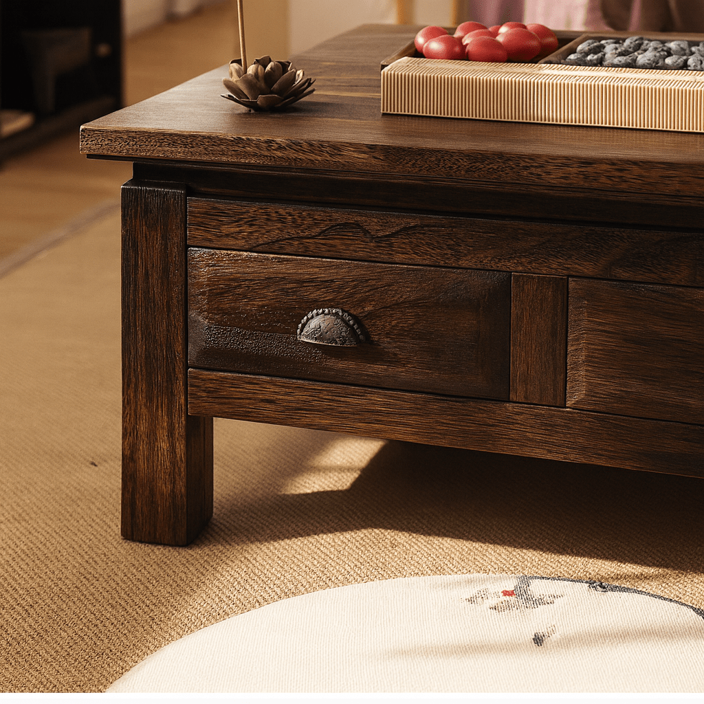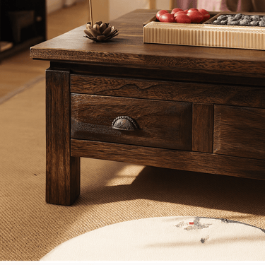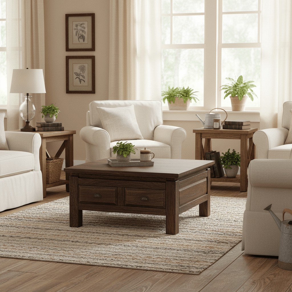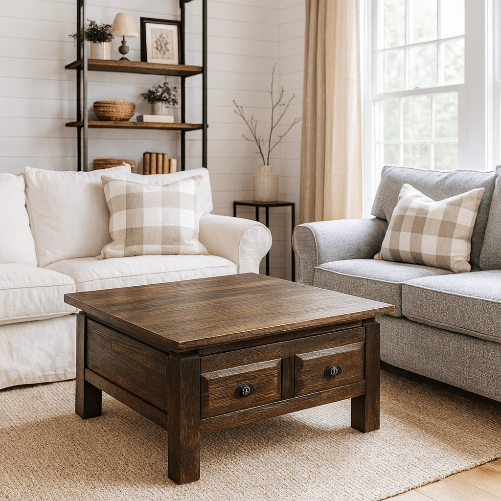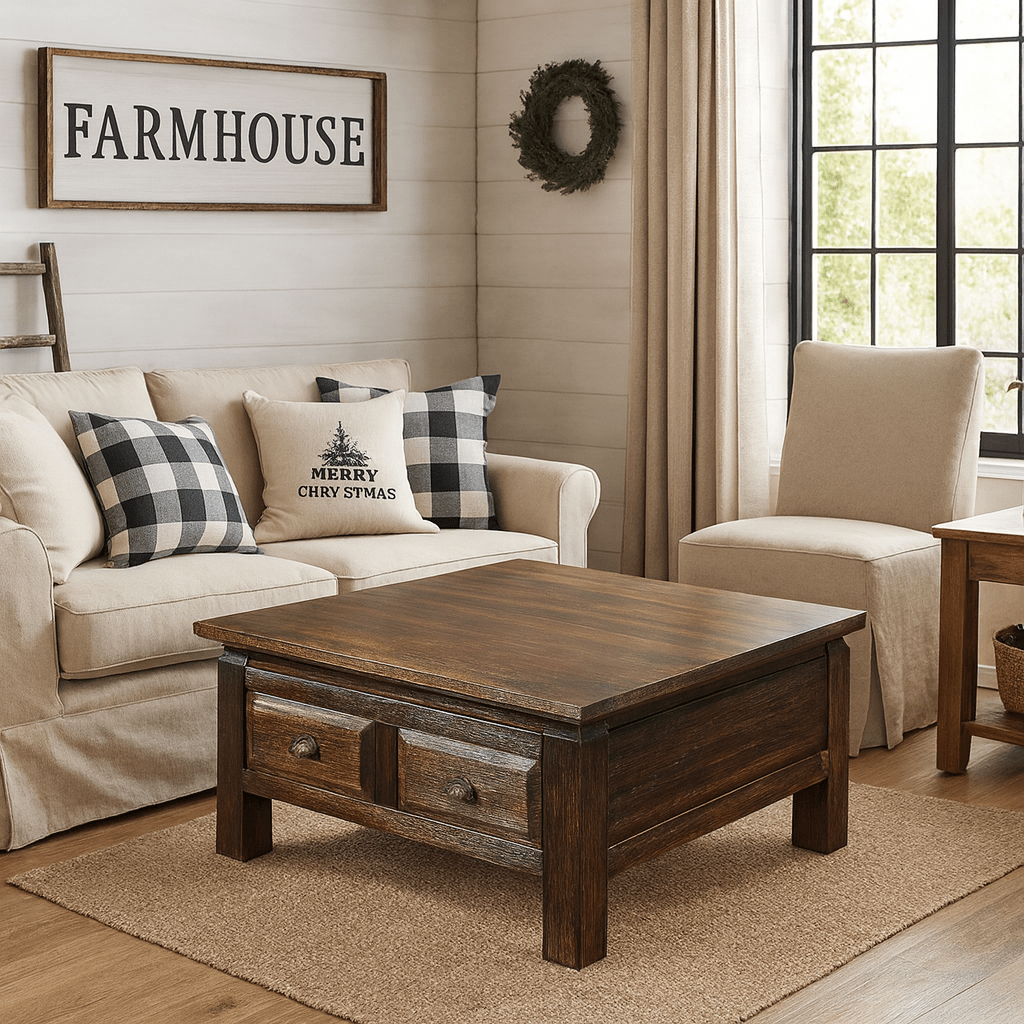 Add warmth and practicality to your living space with this Rustic Farmhouse Solid Wood Coffee Table. Expertly handcrafted from durable solid wood, this table features a deep, natural grain finish that highlights the organic texture of the wood. Its clean square shape and sturdy structure evoke a timeless farmhouse feel, while the two built-in drawers provide discreet storage for remotes, coasters, and magazines. Perfectly suited for Modern Farmhouse, Rustic Country, or Cottagecore homes, this piece anchors your living room with its understated elegance and solid craftsmanship. Pair it with neutral linens, woven textures, and soft lighting to complete the cozy farmhouse aesthetic.