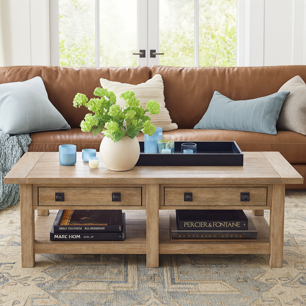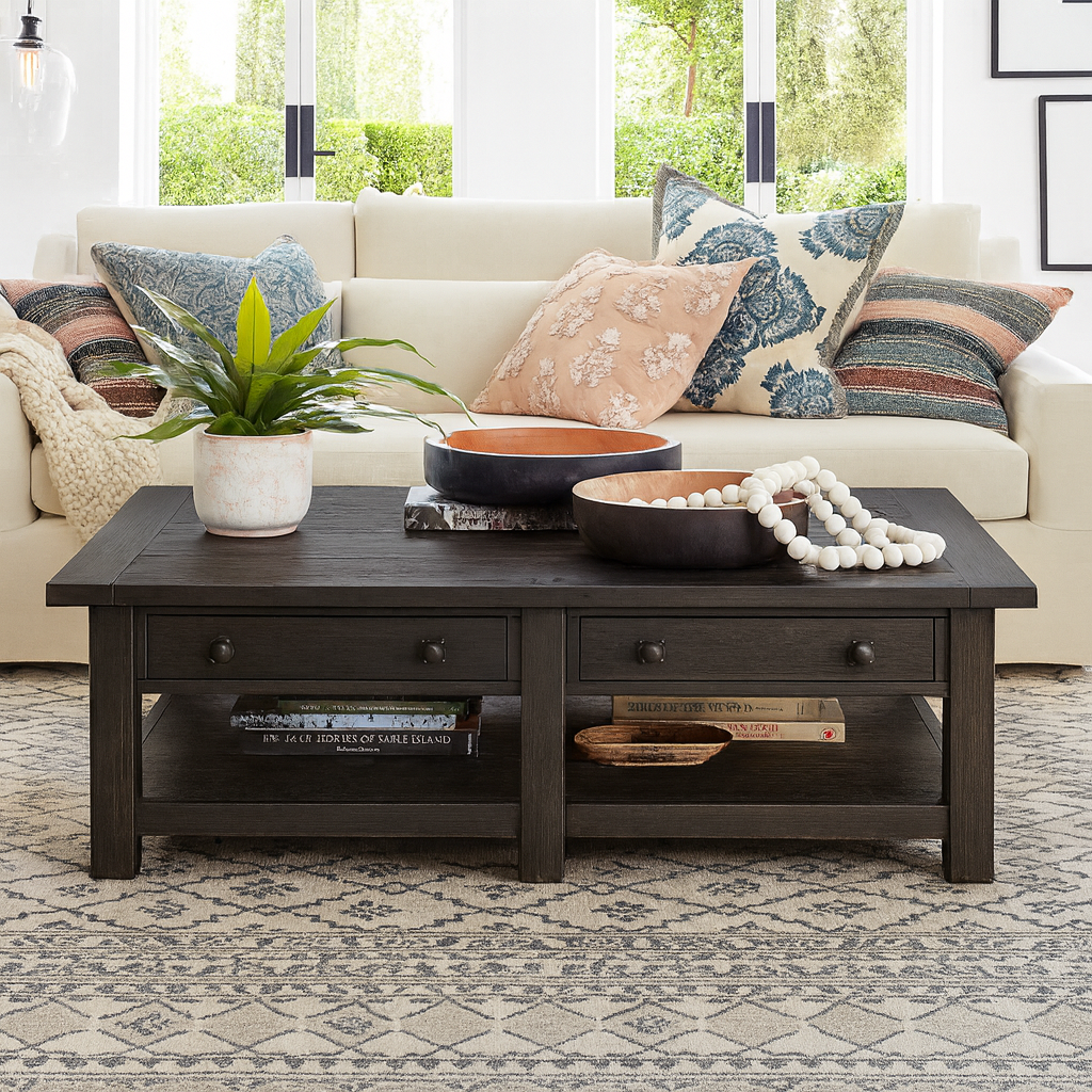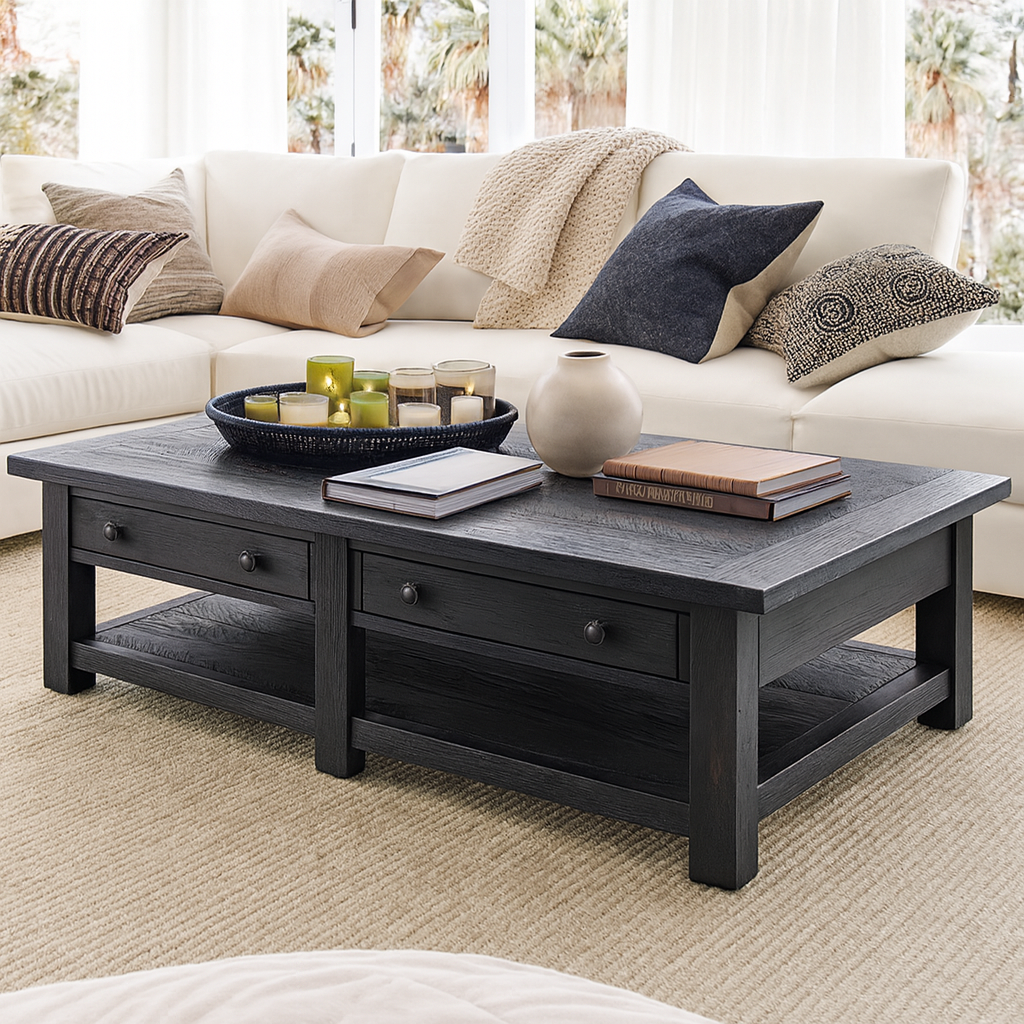 Beautifully crafted from solid wood, this coffee table exudes a rich, grounding presence. Its deep, charcoal-brown finish highlights the natural wood grain while complementing both modern and farmhouse interiors. The dual drawers offer discreet storage for remotes, coasters, or accessories, while the open lower shelf is ideal for books, baskets, or decor. Designed for both function and aesthetics, its clean lines, metal knob handles, and sturdy frame bring together practicality and timeless appeal. Whether styled in a cozy living room or a sophisticated sitting area, this piece anchors your space with warmth, craftsmanship, and character. Perfect for Japandi, rustic, or coastal farmhouse interiors seeking balance between utility and refined simplicity.