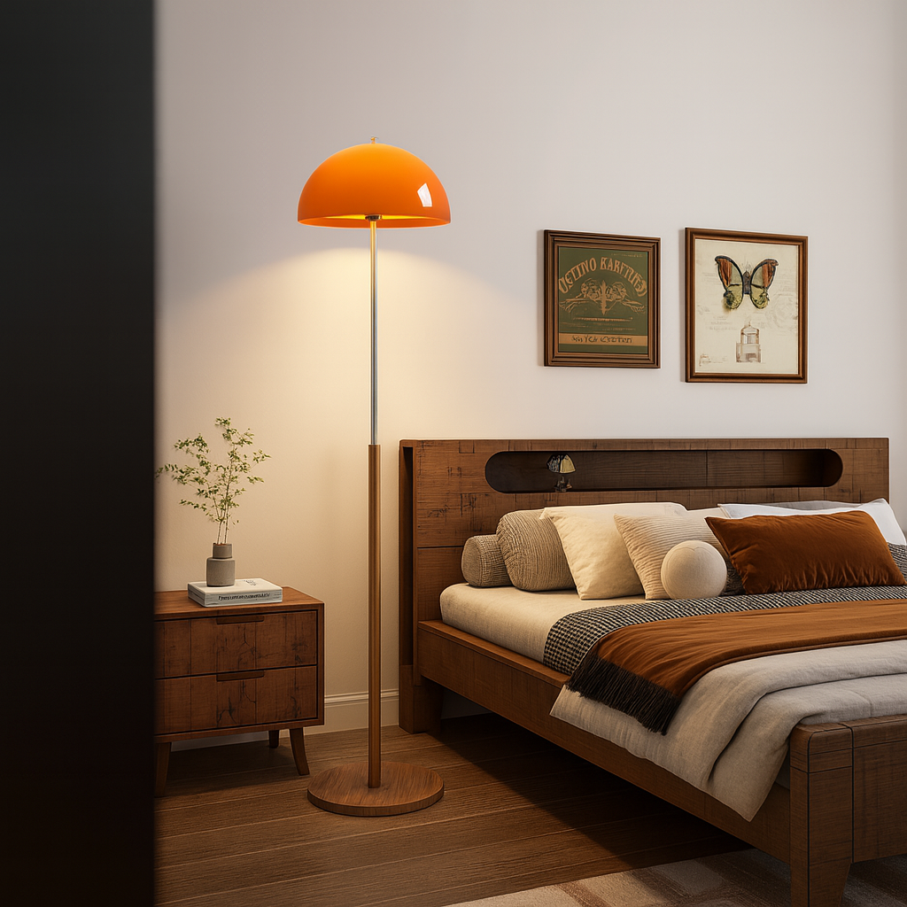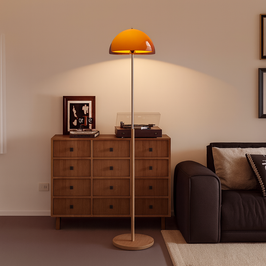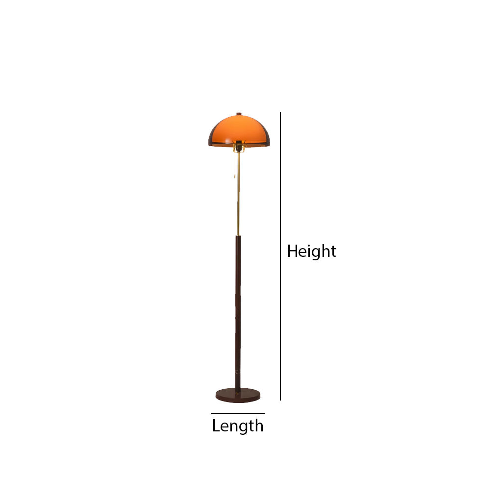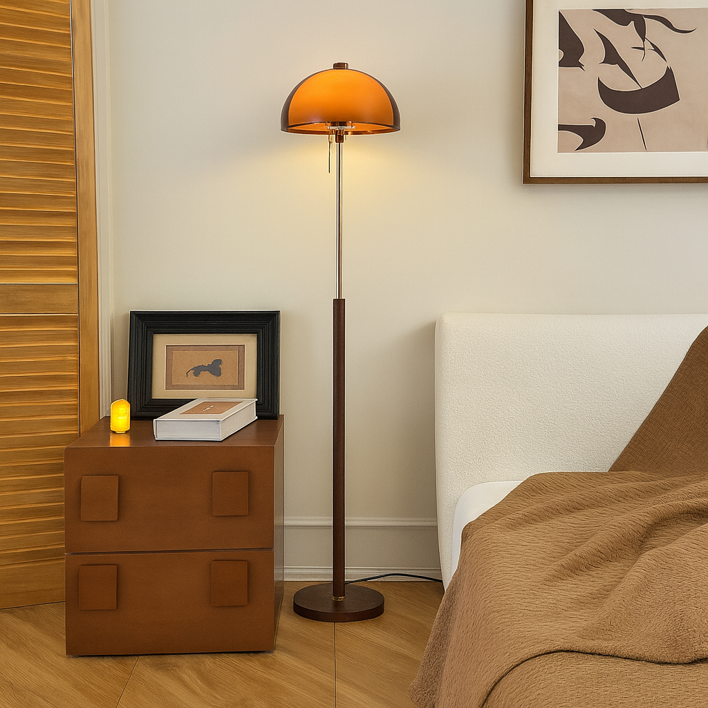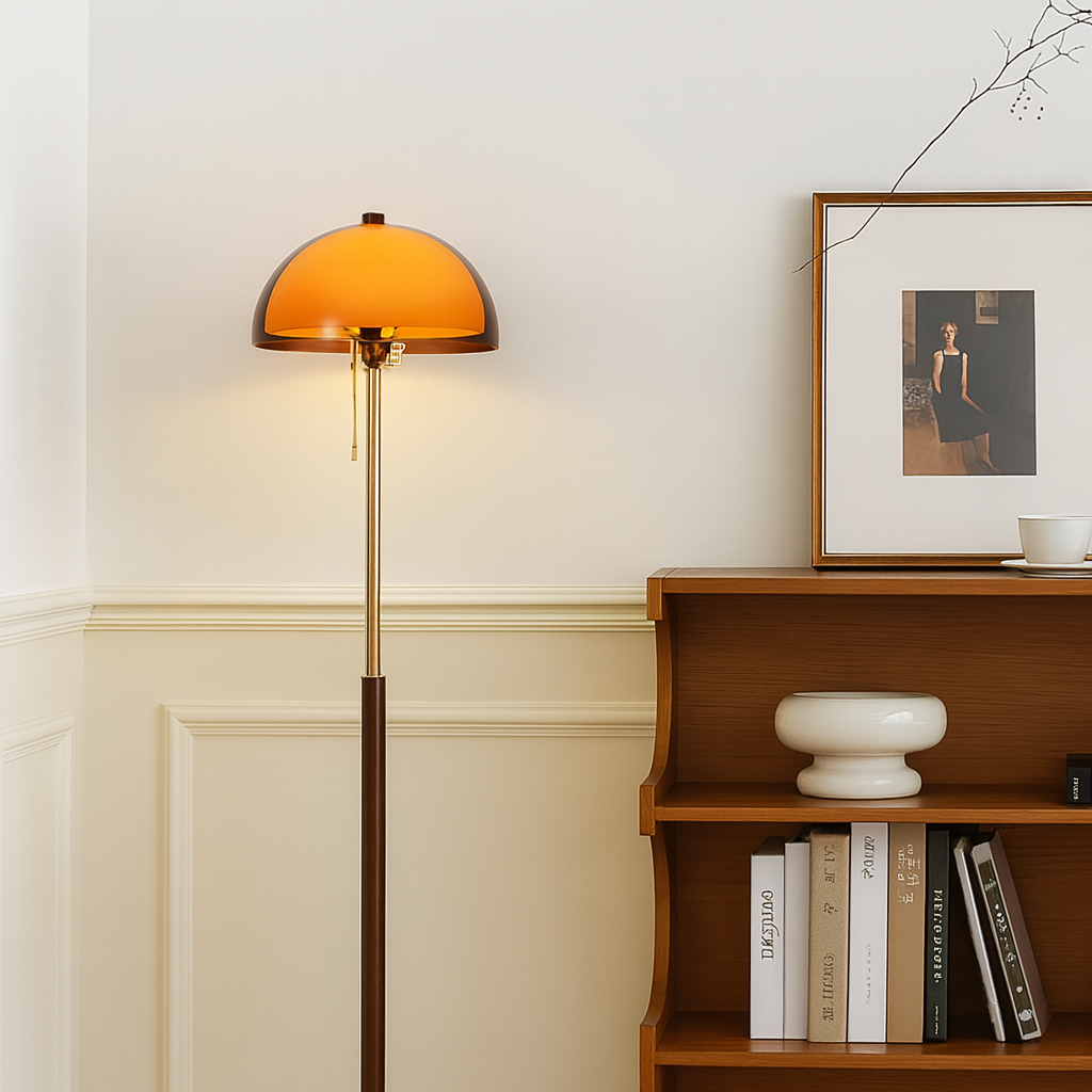 Inspired by mid-century design, this floor lamp adds a soft retro touch to contemporary interiors. The rounded dome shade diffuses light gently, offering a warm and inviting glow perfect for reading corners or evening ambience. Crafted with a slender brass stem and a solid wood base, the lamp balances style and stability. The pull-chain switch provides convenient operation, while the compact footprint makes it suitable for both small and spacious rooms. Ideal for living rooms, bedrooms, or study areas, this piece enhances the atmosphere with a blend of vintage charm and modern simplicity. Pair it with wooden or neutral-tone furniture to achieve a harmonious interior look.