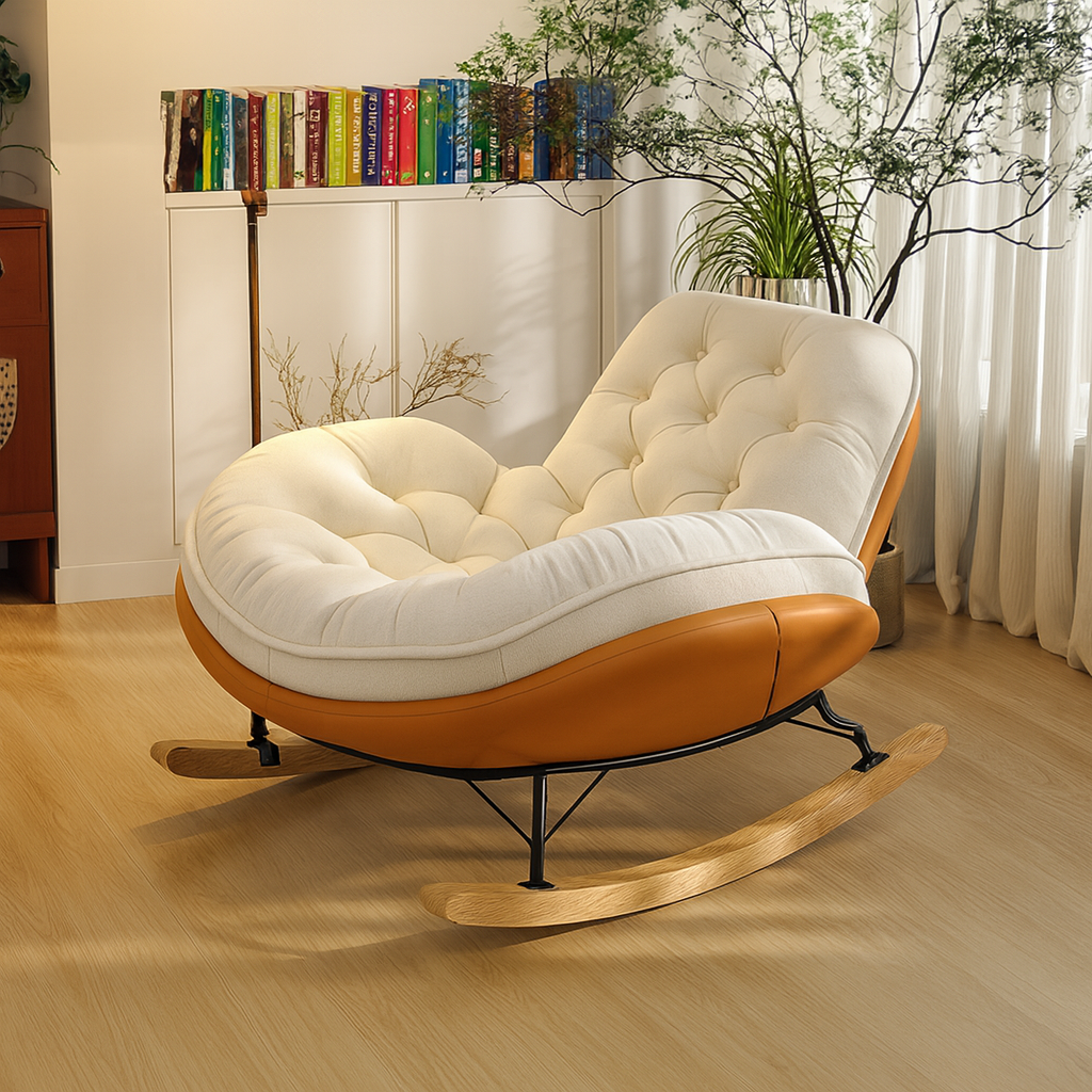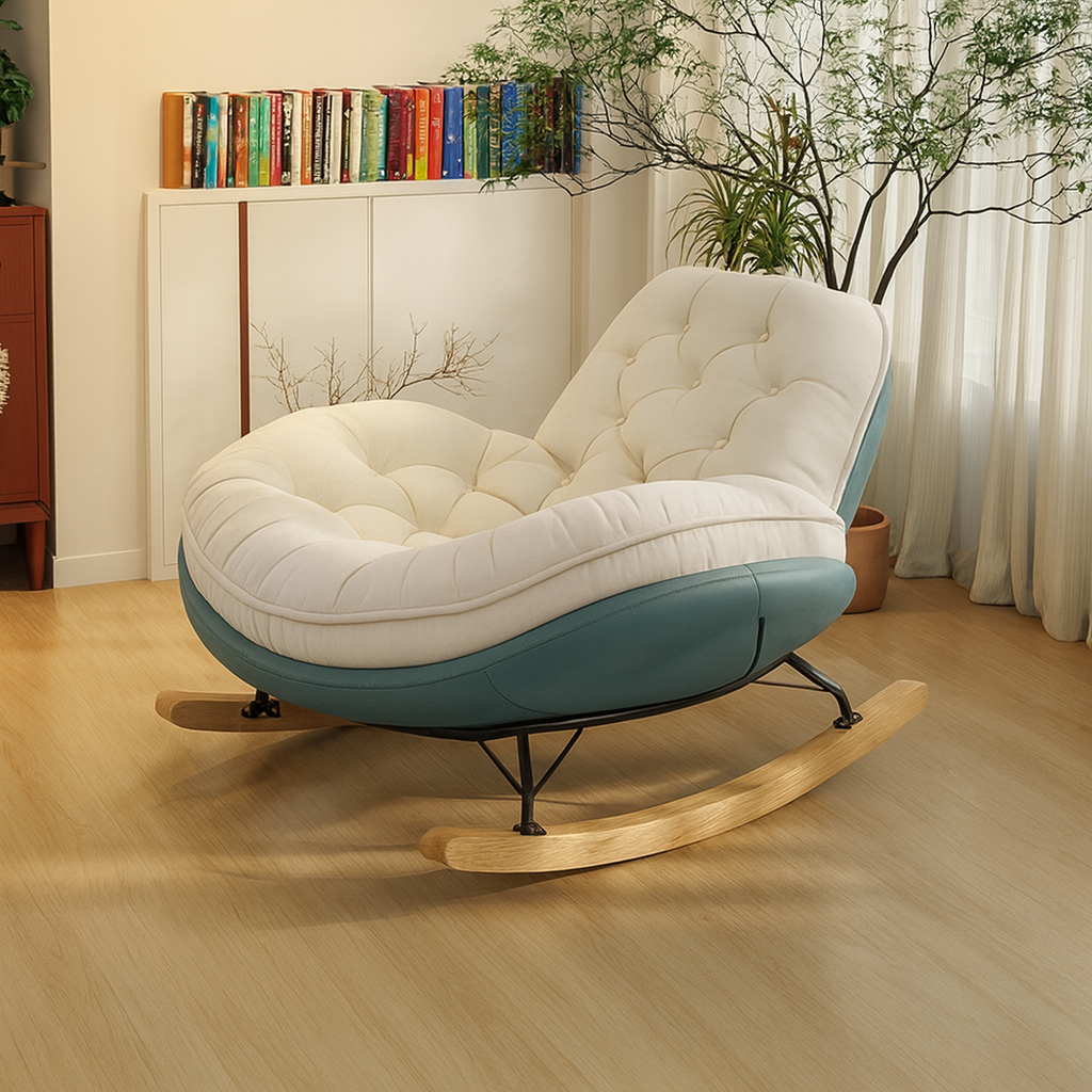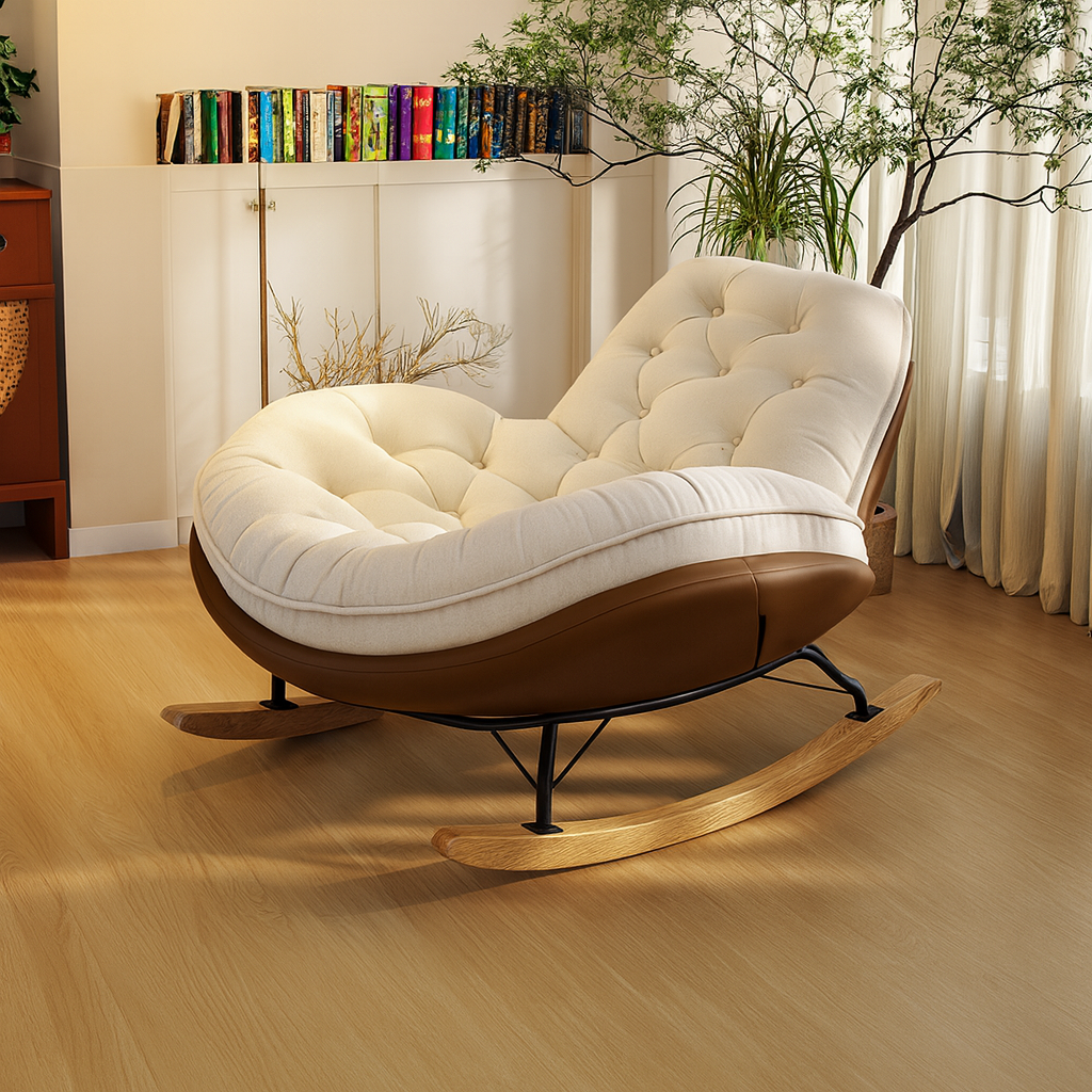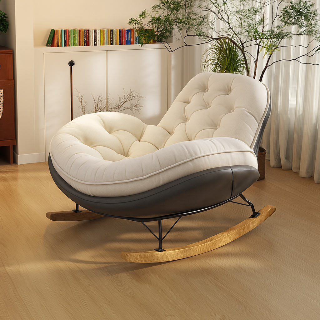 Blending comfort with contemporary design, this modern rocking lounge chair is a perfect addition to living rooms or reading spaces. Its tufted cushioned seat provides a soft and inviting place to relax. The chair is designed with a sturdy curved wooden base and metal supports, ensuring smooth rocking motion and lasting stability. The combination of fabric upholstery and sleek structural elements creates a stylish look. Ideal for relaxing, reading, or unwinding, this rocking lounge chair brings both comfort and modern elegance to your home environment.