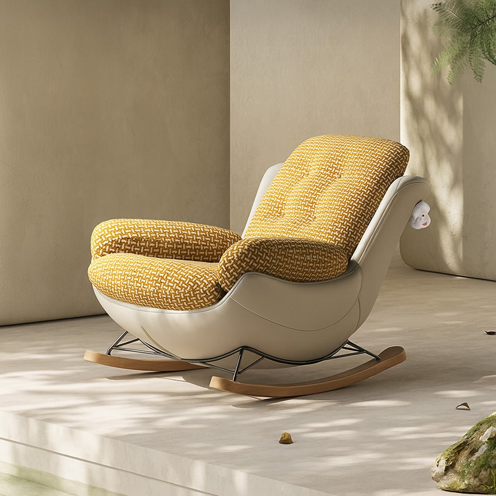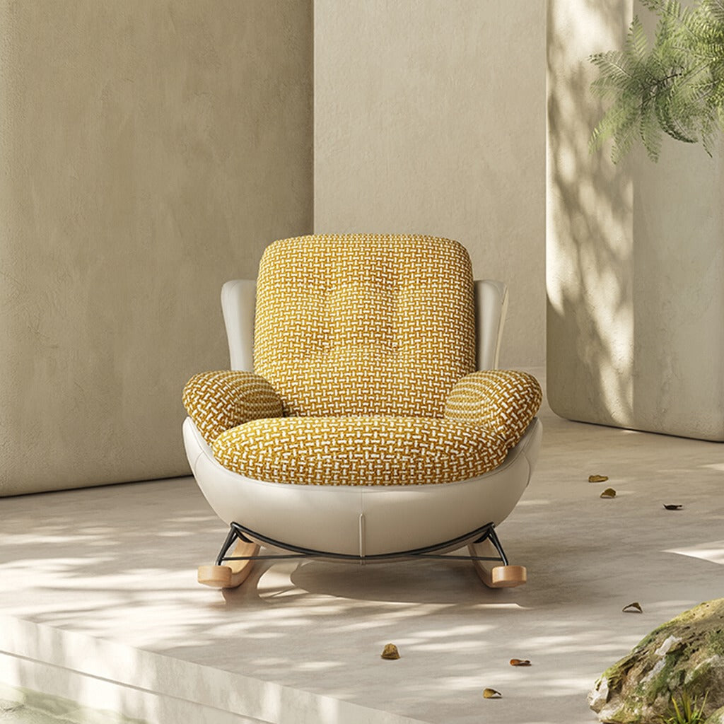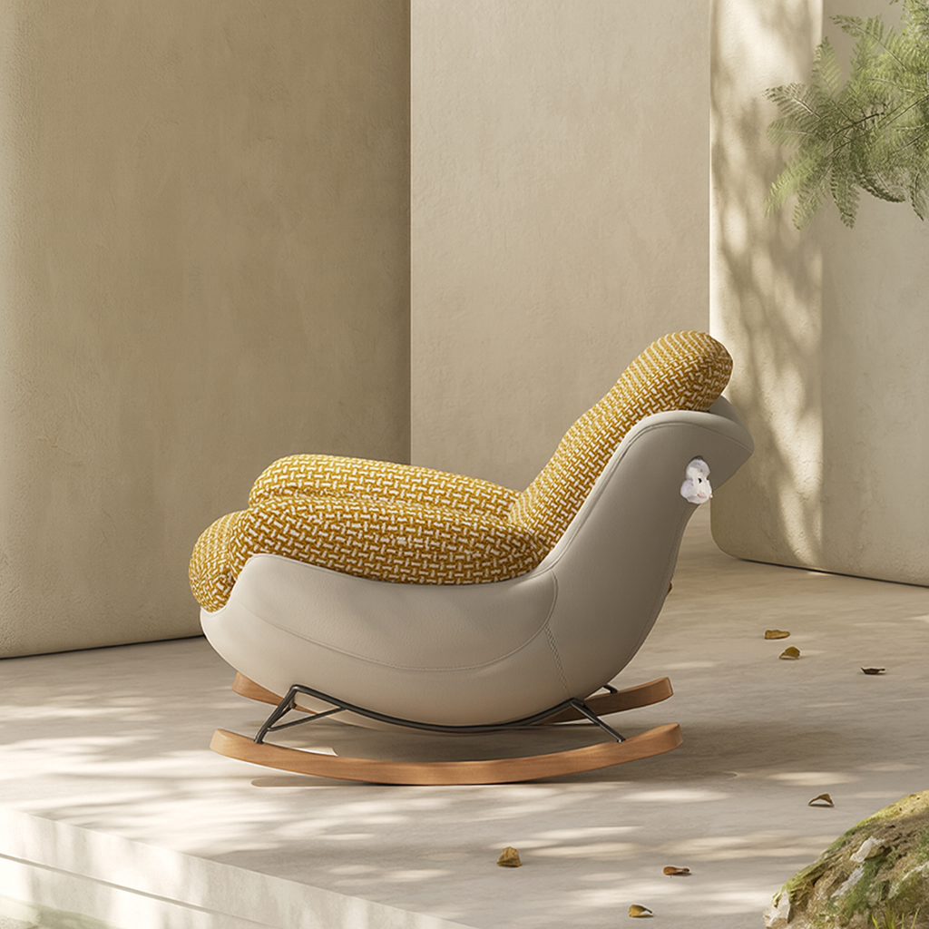 Blending modern aesthetics with gentle motion, this rocking chair adds a refined yet cozy touch to any living area. The design features a curved seat structure with plush cushioning, inviting relaxation while maintaining a sleek contemporary look. The seat is upholstered in textured woven fabric for warmth and visual depth, complemented by a smooth leather-like shell and sturdy wooden rockers. Its ergonomic form ensures balanced support, making it ideal for reading, lounging, or quiet moments of rest. Perfect for living rooms, bedrooms, or modern reading nooks, this chair enhances any space with its combination of comfort and sculptural appeal. The natural tones and clean lines allow it to harmonize beautifully with minimalist, Scandinavian, or Japandi interiors.
