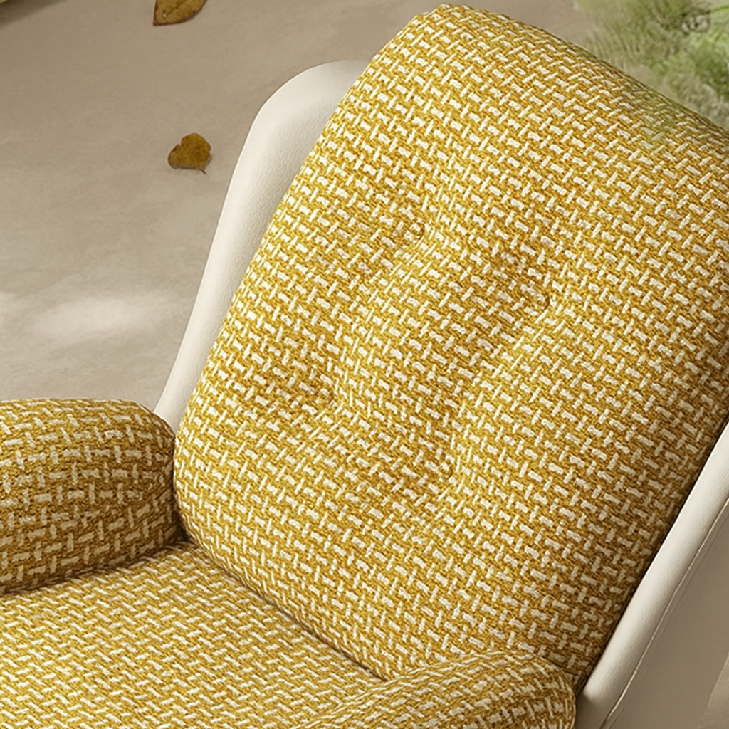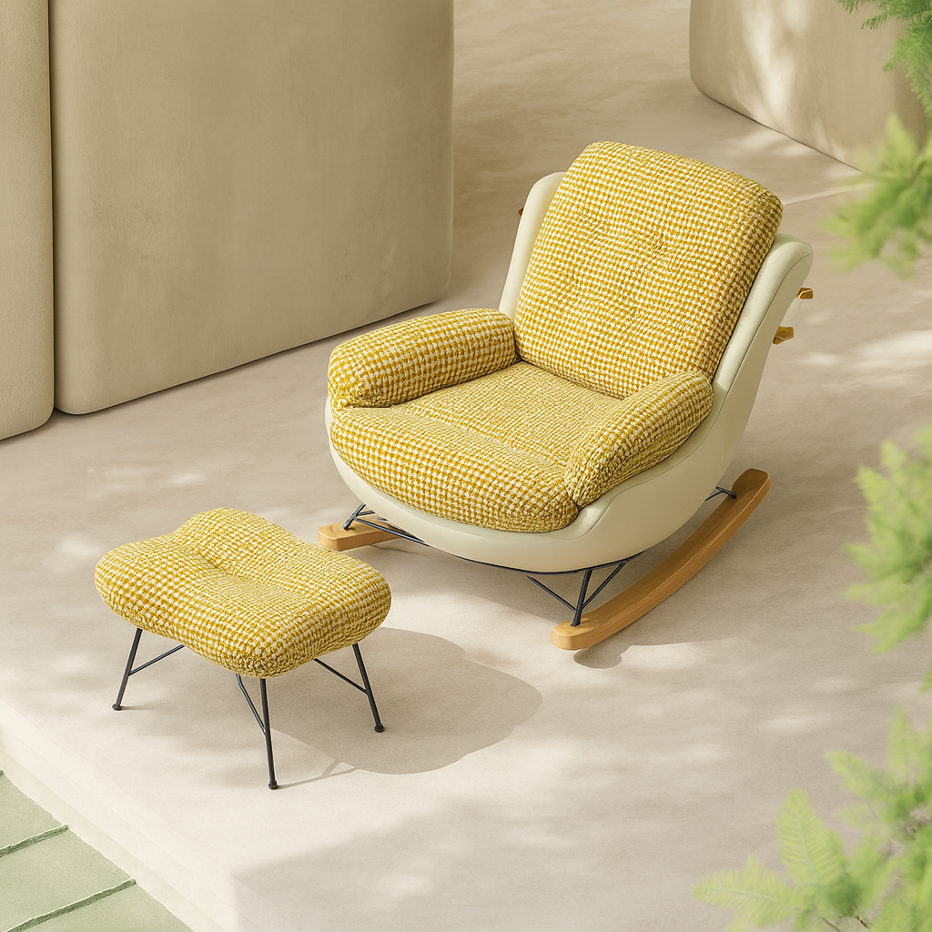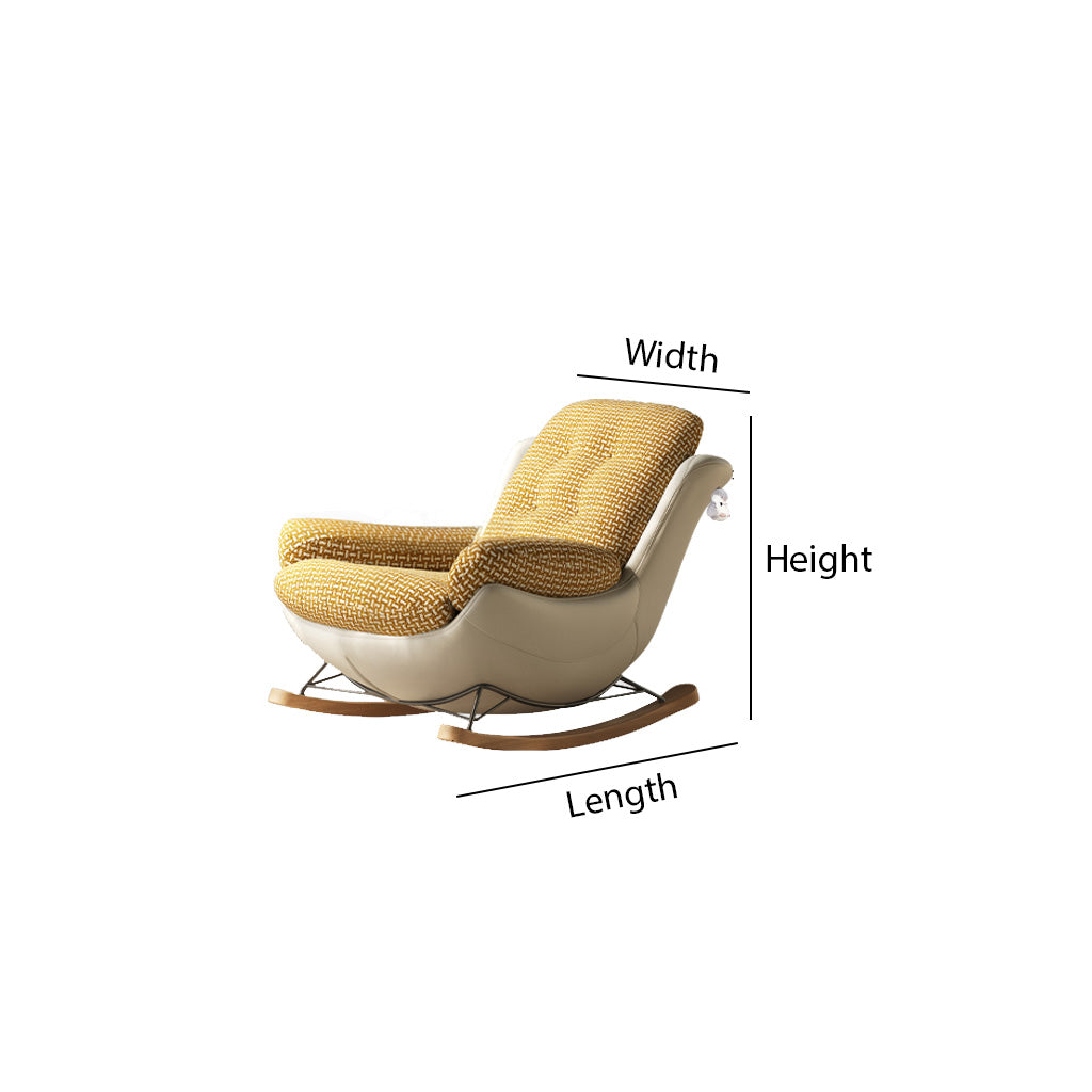 Blending modern aesthetics with gentle motion, this rocking chair adds a refined yet cozy touch to any living area. The design features a curved seat structure with plush cushioning, inviting relaxation while maintaining a sleek contemporary look. The seat is upholstered in textured woven fabric for warmth and visual depth, complemented by a smooth leather-like shell and sturdy wooden rockers. Its ergonomic form ensures balanced support, making it ideal for reading, lounging, or quiet moments of rest. Perfect for living rooms, bedrooms, or modern reading nooks, this chair enhances any space with its combination of comfort and sculptural appeal. The natural tones and clean lines allow it to harmonize beautifully with minimalist, Scandinavian, or Japandi interiors.
