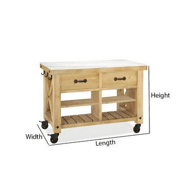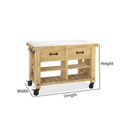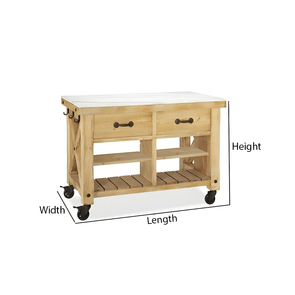 Designed for both utility and style, this modern wooden kitchen island cart enhances everyday cooking and dining activities. The rectangular structure offers a sturdy workspace suitable for meal prep or serving. It features two drawers for utensils, open shelves for storage, and side hooks for towels or kitchen tools. The cart’s mobile design includes lockable caster wheels for easy movement and secure placement. Ideal for kitchens, dining spaces, or outdoor gatherings, this piece brings warmth and practicality to any setting while keeping essentials organized and accessible.