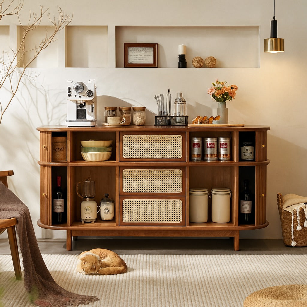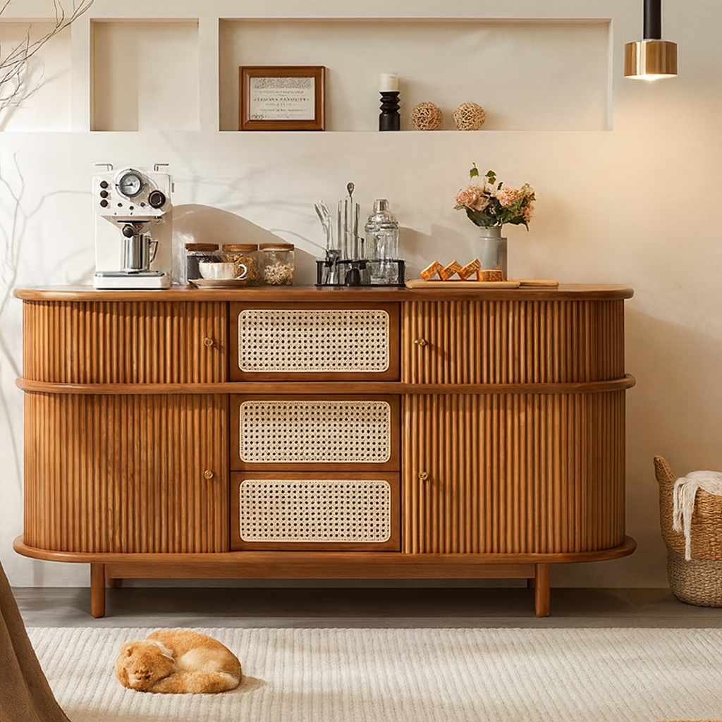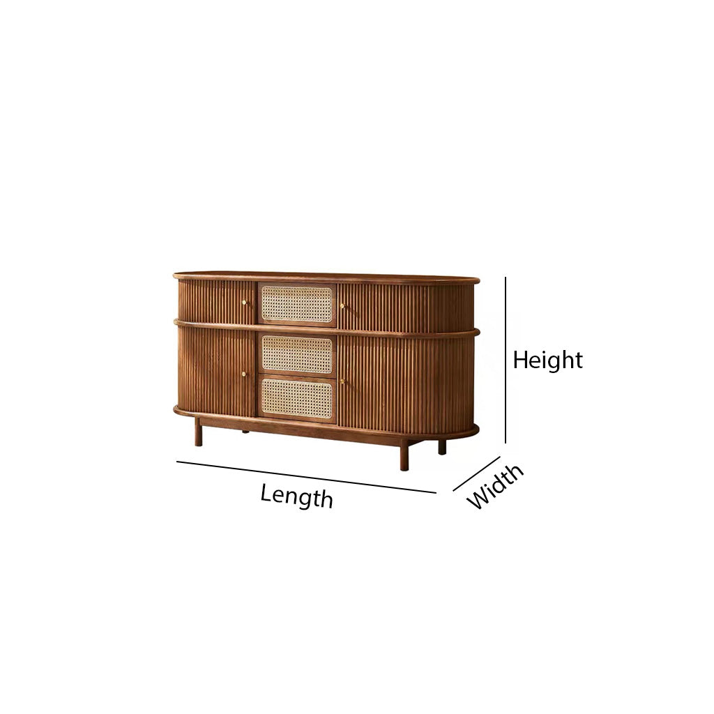 Blending natural charm with vintage design, this wooden sideboard cabinet is perfect for creating a warm and inviting atmosphere in your home. Its rounded edges and grooved wood detailing give it a timeless appeal that fits seamlessly into a variety of interior styles. The cabinet includes multiple drawers and doors with rattan front panels, providing generous storage space for dining essentials, books, or decorative items. Brass-finished handles add a subtle touch of elegance, while the raised legs ensure both stability and easy cleaning underneath. Ideal for living rooms, dining areas, or hallways, this sideboard cabinet serves as both a practical storage solution and a decorative piece. Its combination of wood and woven textures enhances the overall character of the room.