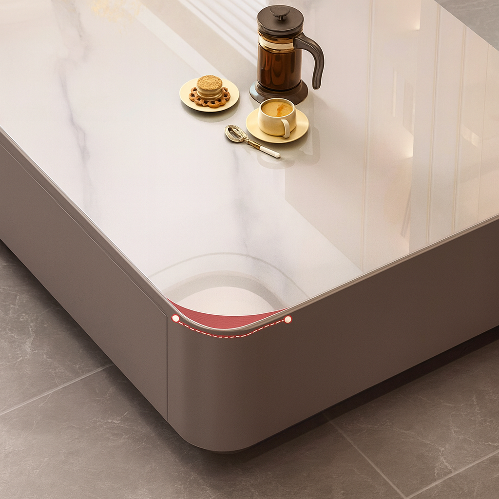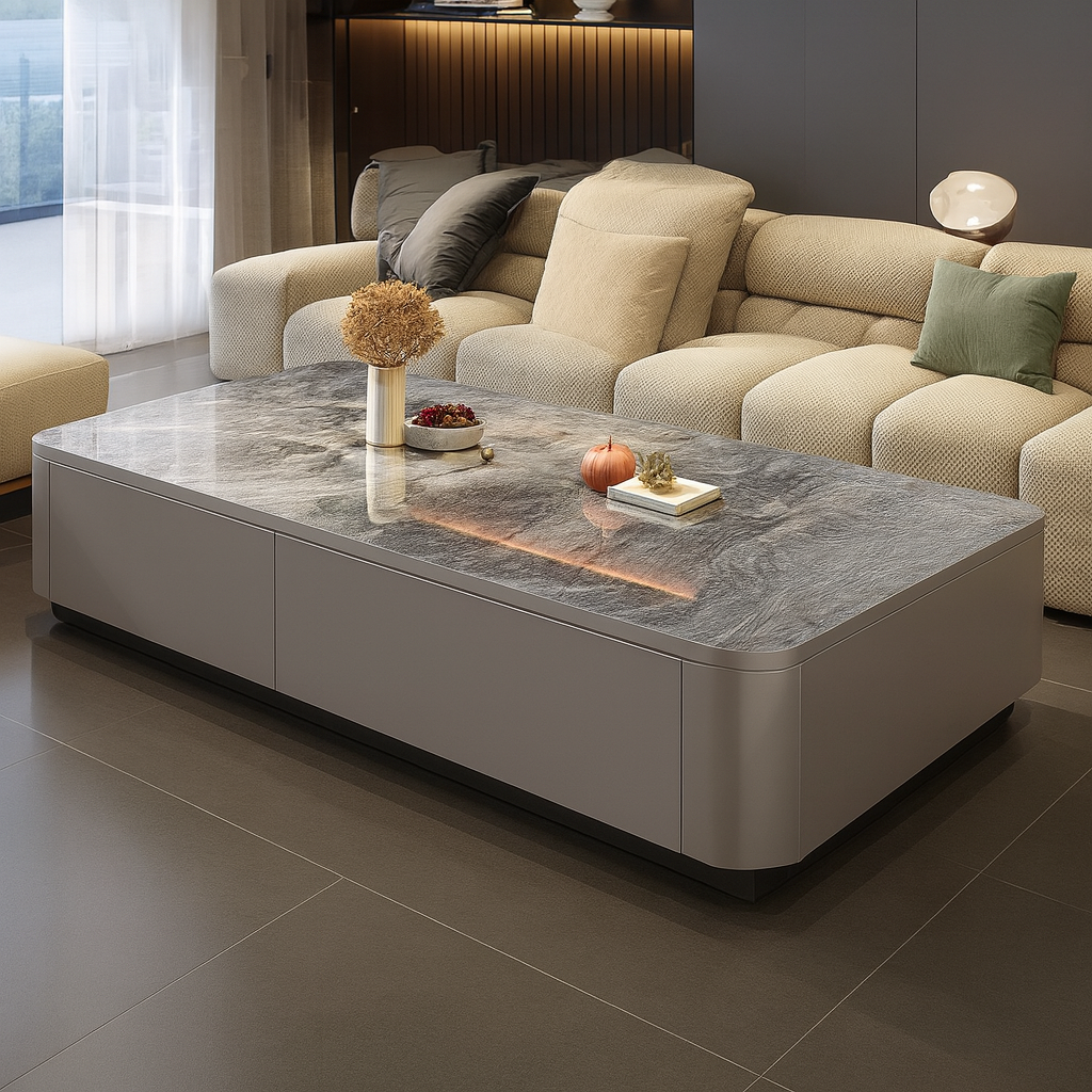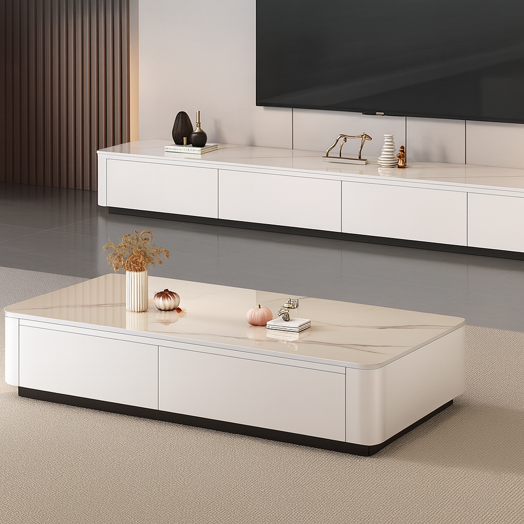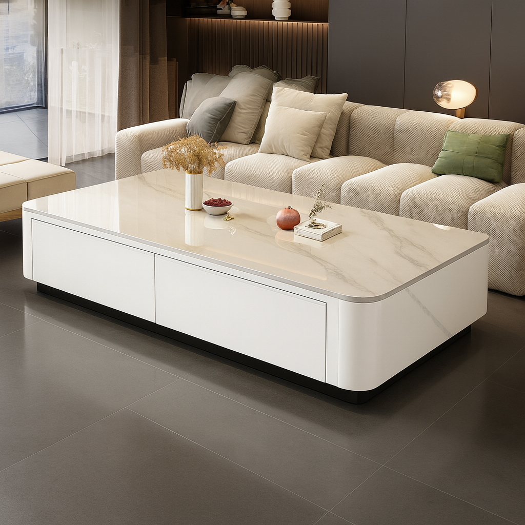 Bring a touch of modern sophistication to your living space with this rectangular coffee table. The high-gloss marble top offers a smooth and reflective surface, complemented by clean white panels and soft rounded corners for a balanced aesthetic. Designed with function in mind, this piece includes discreet storage drawers that maintain the table’s streamlined look while offering convenient space for everyday essentials. The wide surface comfortably accommodates decor, trays, or books, making it a versatile choice for both formal and relaxed settings. Whether you're curating a minimalist home or enhancing a modern interior, this table delivers practical style with effortless charm.