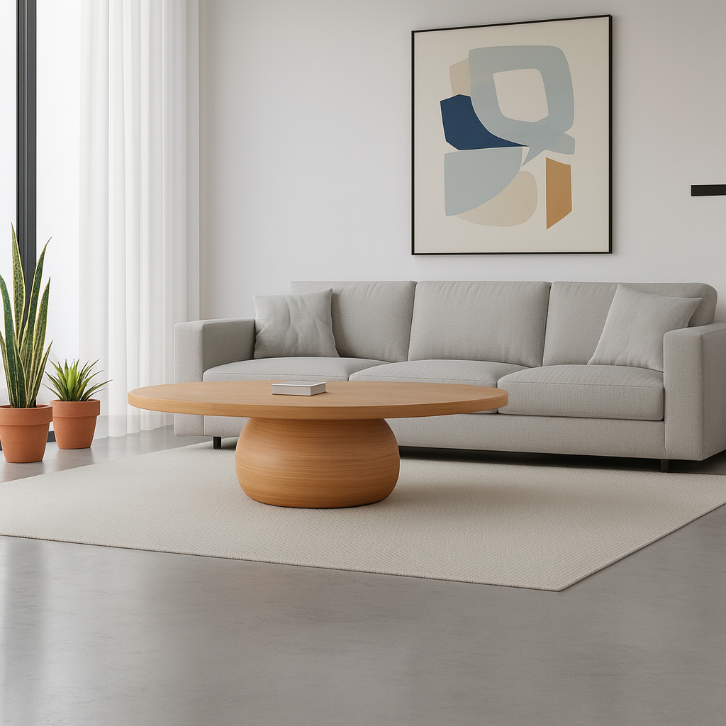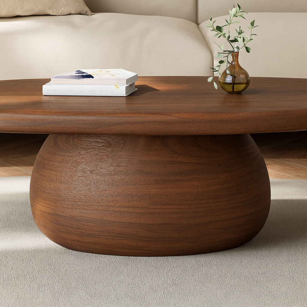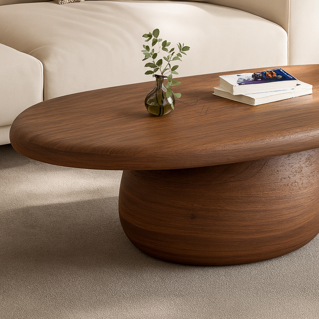 Crafted with a contemporary aesthetic, this wooden coffee table features a beautifully curved oval surface that exudes simplicity and balance. The seamless silhouette and soft edges lend a sense of calm and sophistication to any living space. The standout element of this piece is its sculptural rounded base, designed to provide both stability and visual appeal. Built from durable wood, it highlights the natural grain and texture that make each table unique. The generous tabletop offers ample space for books, décor, or a simple centerpiece. Perfect for modern and minimalist interiors, this coffee table combines artful design with everyday functionality. Its organic form and warm wooden tone bring harmony and elegance to the living room, making it a stylish and inviting focal point.