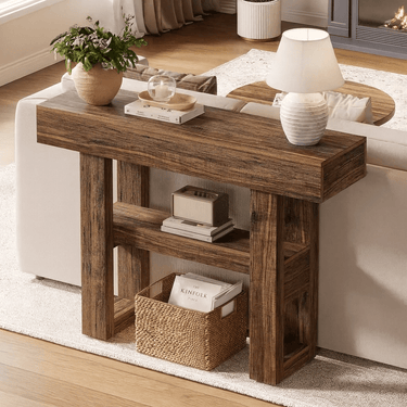 Blending Farmhouse aesthetics with subtle medieval influences, this console table brings a sense of balance and tranquility to any entryway or hallway. The linear form and solid wood grain highlight its natural beauty and simplicity. Crafted from solid wood, the table includes an open lower shelf for decorative storage, maintaining both function and understated elegance. Its sturdy build and earthy tones create a warm, welcoming impression.