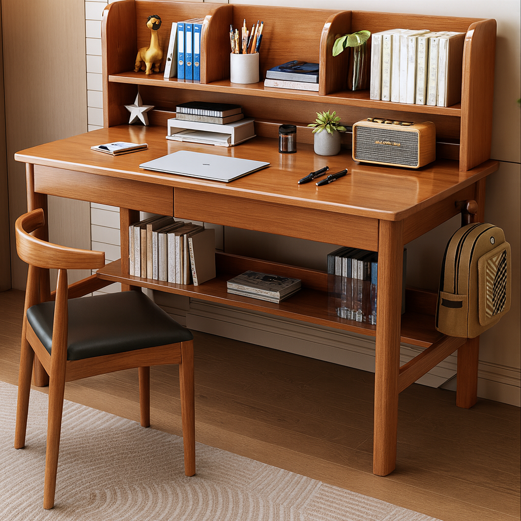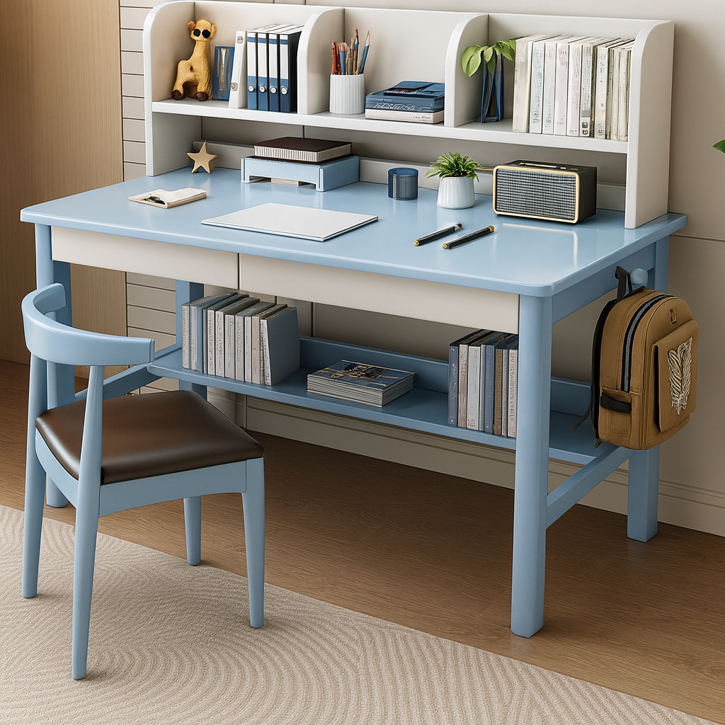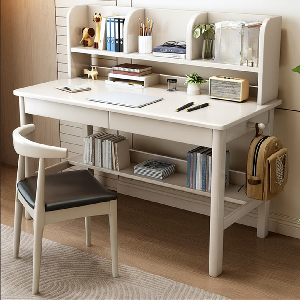 This modern study desk offers both function and simplicity, ideal for students, teens, or remote workers seeking a clean and organized workspace. The desk features a spacious tabletop for laptops and study materials, while the raised bookshelf keeps books, decor, and stationery within easy reach. Two drawers underneath the tabletop provide hidden storage for papers, gadgets, supplies, helping keep your workspace clutter free. An additional lower shelf is perfect for storing larger books or boxes. A built-in hook on the side offers a convenient spot for hanging backpacks or headphones. Crafted in a neutral beige tone with smooth, rounded corners, this desk complements any room decor from children’s study nooks to modern home offices.