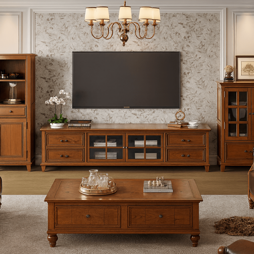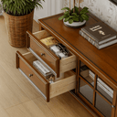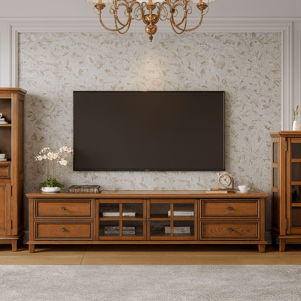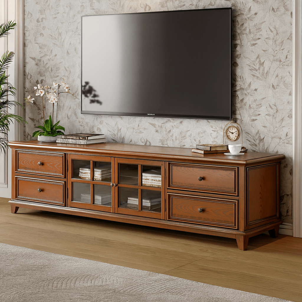 Bring a touch of refined elegance to your living room with this classic solid wood TV stand, designed for both functionality and timeless charm. Crafted from premium solid wood, it features a rich brown finish that highlights the solid wood grain. The design includes four spacious drawers and two glass-panel doors, offering a perfect balance between concealed and visible storage. Store your books, remotes, or electronics neatly, while the glass cabinets display your favorite decor pieces. Elegant molding details and sturdy tapered legs add a subtle vintage character, making this piece ideal for traditional, farmhouse, or transitional home styles.